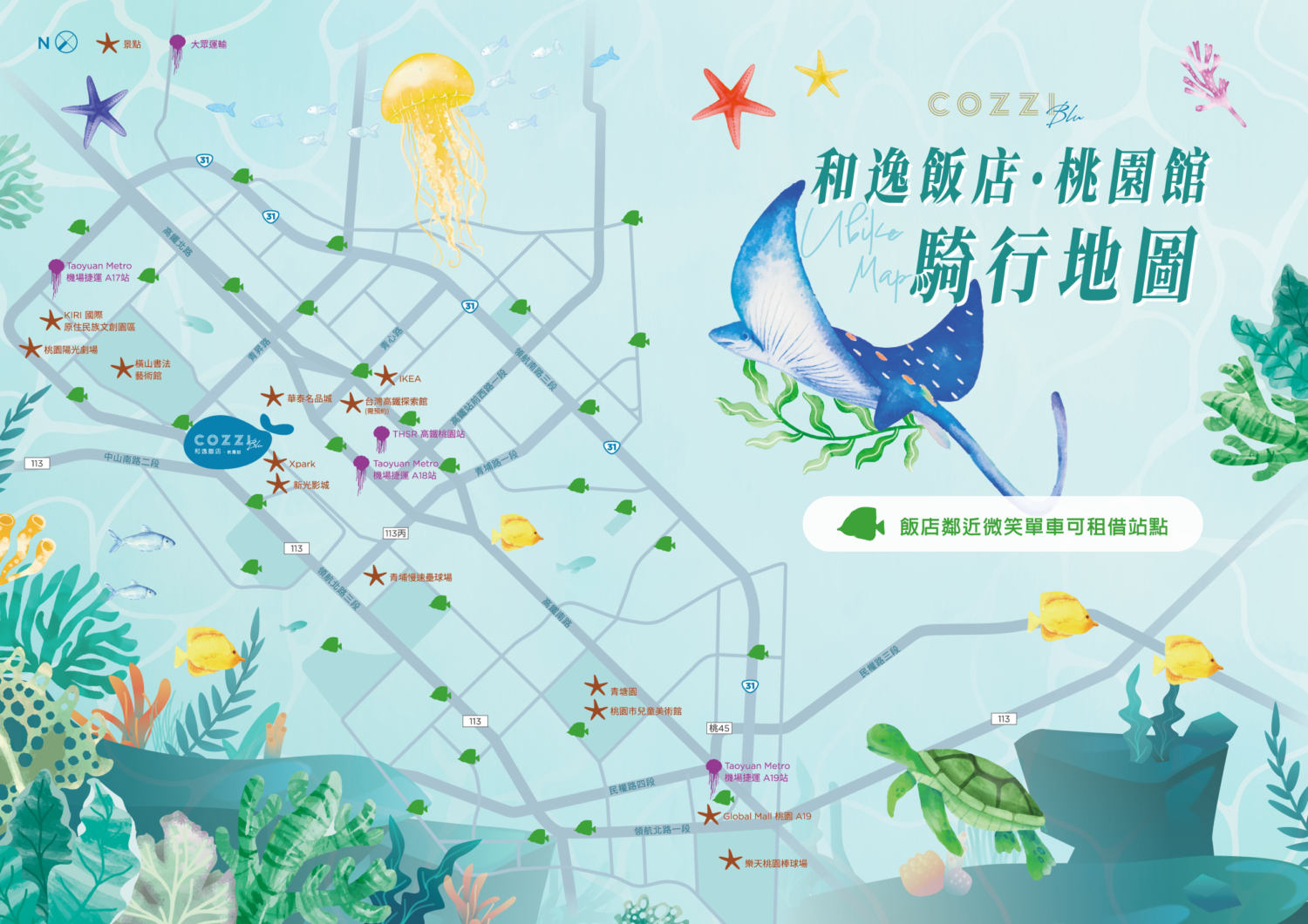 出了 COZZI Blu 和逸飯店・桃園館後,步行約1分鐘即可抵達位於置地廣場桃園 (新光影城對側)最近的Youbike租賃站。