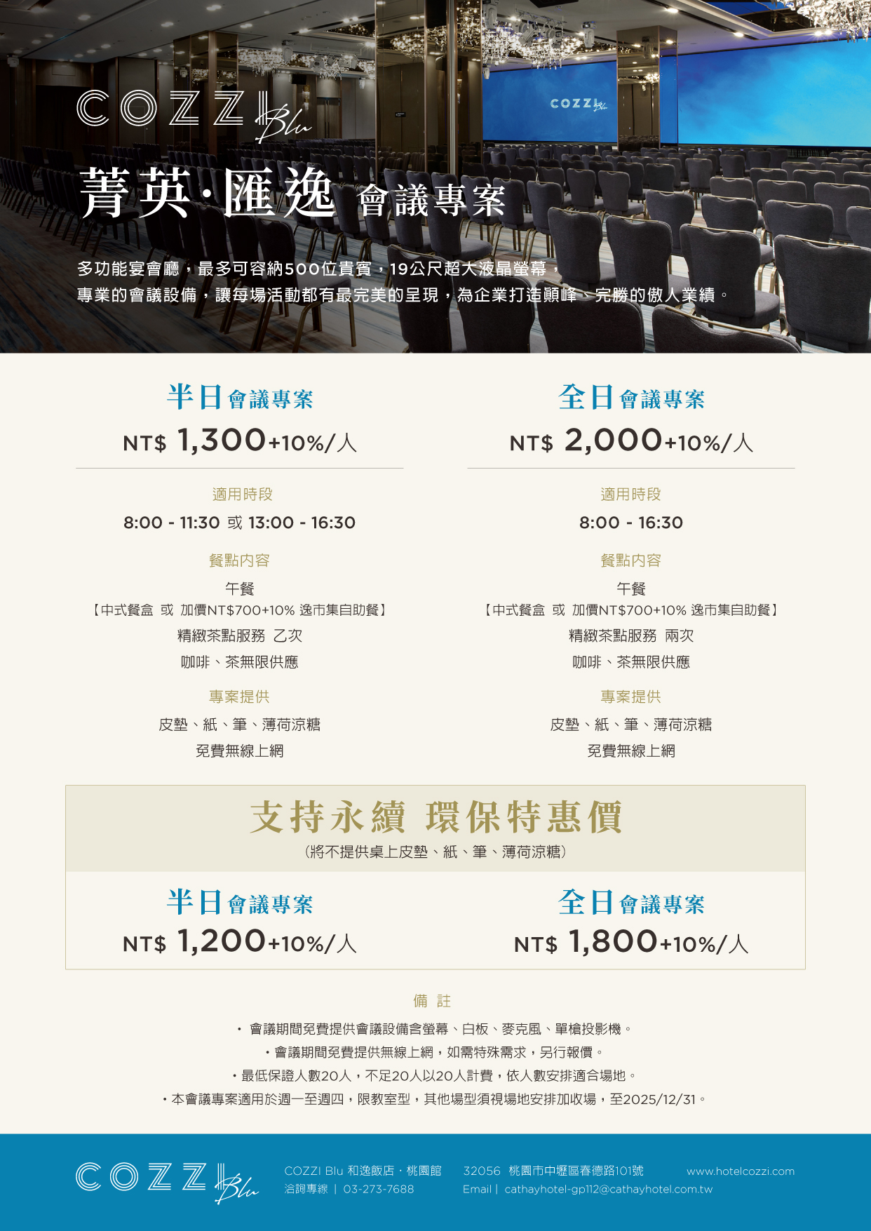 - 本會議專案適用於週一至週四,限教室型,其他場地須視場地安排加收場地費用,至2025/12/31。