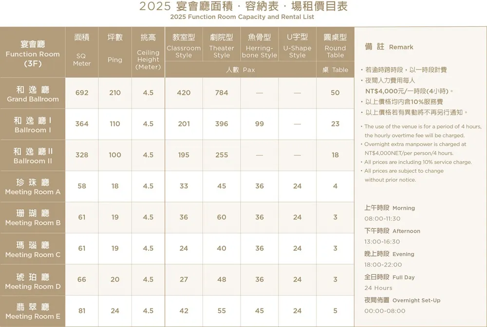 - 最低保證人數20人,不足20人以20人計費,依人數安排合適場地。
