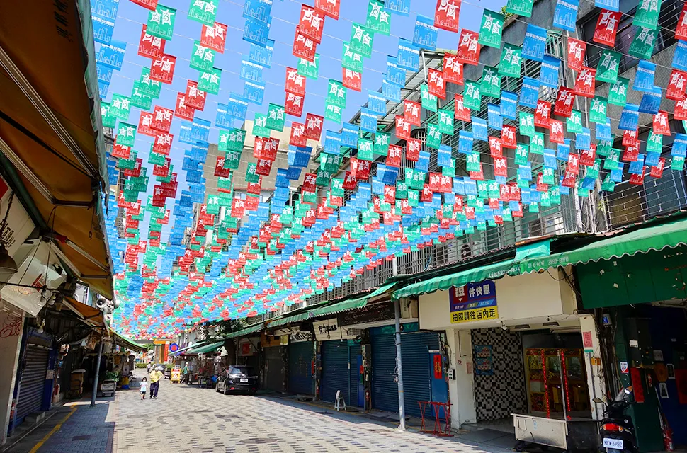 四平陽光商圈與夜市最大不同在於它是日間開放。街道徒步區上隨處可見露天咖啡座及咖啡香、不定時的街頭藝人表演驚喜、懸掛於天空隨風飄揚的四色布旗,讓這條不算長的徒步區增添了許多浪漫情懷與無限想像過去。