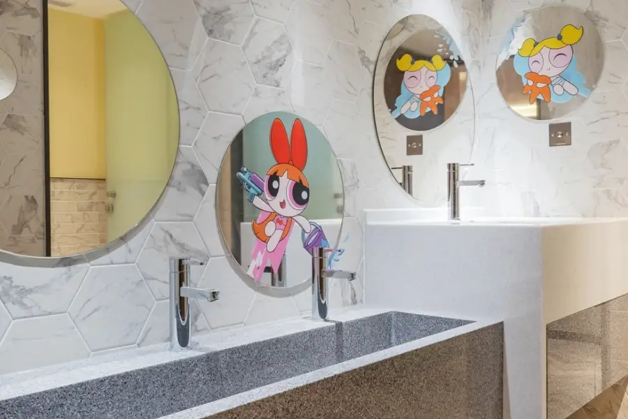 貼心打造親子友善的盥洗空間,設有大小馬桶、高低洗手台等貼合不同年齡需求的設施,每個角落都可見《探險活寶》、《飛天小女警》及《熊熊遇見你》角色的俏皮身影,讓孩子使用廁所也充滿趣味與互動感。