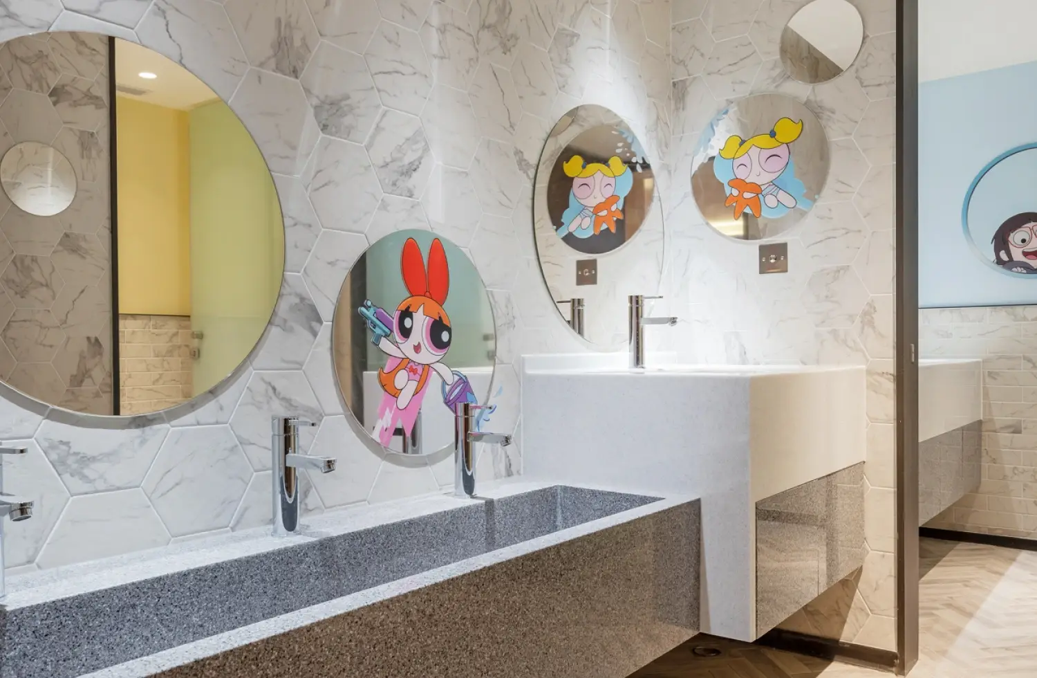 貼心打造親子友善的盥洗空間,設有大小馬桶、高低洗手台等貼合不同年齡需求的設施,每個角落都可見《探險活寶》、《飛天小女警》及《熊熊遇見你》角色的俏皮身影,讓孩子使用廁所也充滿趣味與互動感。