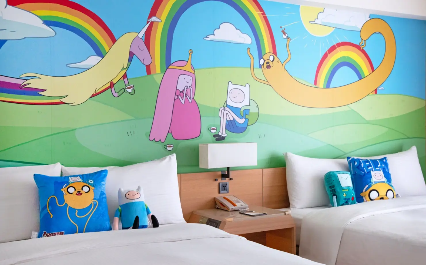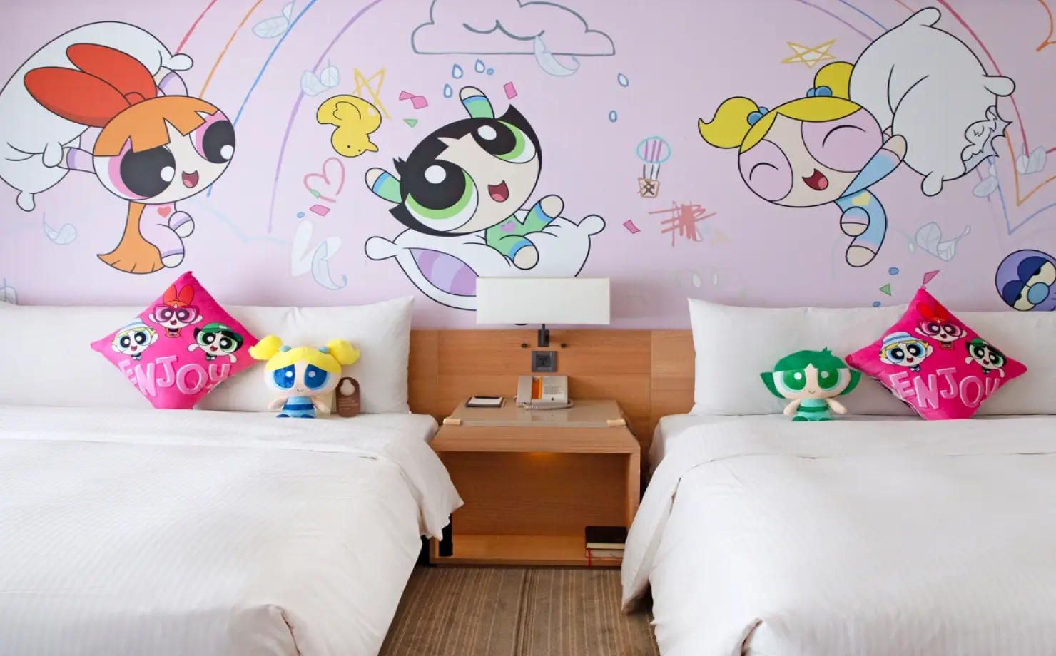 卡通頻道主題客房內結合了探險活寶、飛天小女警與熊熊遇見你三部卡通共18款豐富的情境壁貼,搭配和逸客房超寬敞明亮空間,二張大床配置也能擁有自在舒適,最適合一家大小或三五好友一同入住
